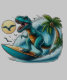 Eine spielerische Darstellung eines T-Rex, der auf einem Surfbrett auf einer Riesenwelle reitet, mit einer Palme und Möwen im Hintergrund. Ein lustiges und humorvolles Design mit einem Dinosaurier, der den Strandlifestyle genießt. farbenfrohes und dynamisches Bild eines prähistorischen Wesens, das die moderne Welt umgibt.