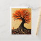 Ein surrealer Baum mit orangefarbenen Blätter und verdrehten Wurzeln.