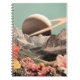 Eine surreale Szene zeigt Saturn, der sich über einer Berglandschaft mit lebhaften Blume im Vordergrund erhebt. Die üppigen Farben kontrastieren mit der himmlischen Kulisse und schaffen eine traumhafte Atmosphäre.
