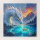 Sci fi surreal Rätsel. Eine schöne Abbildung weißer Drache, der einen Goldfisch anschaut, während Vulkane im Hintergrund ausbrechen.