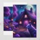 Surreale Hütte im Wald mit Wolf, Pilzen, Bäumen, Sternen und Mond
