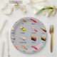 Bilder von Sushi und den verschiedenen Typen auf Party-Papier-Tellern vor einem hellgrauen Hintergrund.