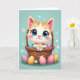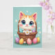 Auf der Vorderseite der Karte sitzt ein animierter orange-gestreifter Kater mit übergroßen blauen Augen gemütlich in einem geflochtenen Korb, seine Wangen sind sanft gerötet, während er mit einem zarten, freundlichen Blick hinausschaut. Die kleinen Pfoten des Kätzchens halten eine weiße Margerite eng umschlossen, wie ein ruhiges kleines Geschenk, das jemand Besonderem angeboten wird 🌷. Der Korb ist mit gesprenkelten, hell gefärbten Ei-Formen gefüllt, und einige sind auf das grüne Gras darunter gefallen, was eine lässige, geteilte Atmosphäre schafft. Hinter der Szene leuchtet ein pastellblauer Hintergrund mit sanftem Licht und ist mit winzigen weißen Blüten getupft, die wie Frühlingskonfetti schweben. Oben erscheint ein kurzer Ostergruß in abgerundeter Schrift, in Weiß mit einer hellrosa Umrandung, damit er sich vom himmelblauen Hintergrund abhebt 🐇. Subtile Schattierungen geben dem Fell und dem Korb