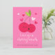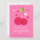 Grußkarte zum Valentinstag. Illustration von süßen Kirschen und Herzen und moderner Schrift "Love you cherry much". Helle rosa Farben.