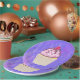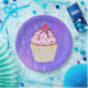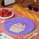 Papier Teller mit einer Illustration eines köstlich aussehenden Kuchen. Rosa Zuckerguss und Schokoladentrizzles. Ein gelber Kuchenhalter und eine Himbeere oben. Ja! Der Hintergrund ist eine lila abstrakte Textur mit kleinen Herzen, die um sich gesprenkelt sind.