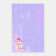 Große Klebrigen mit einer Illustration eines köstlich aussehenden Kuchen. Rosa Zuckerguss und Schokoladentrizzles. Ein gelber Kuchenhalter und eine Himbeere oben. Ja! Der Hintergrund ist eine lila abstrakte Textur mit kleinen Herzen durchdrungen.