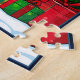 Ein niedlicher Panda, der einen grünen Weihnachtspullover und einen Santa-Hut trägt, steht zwischen dekorierten Weihnachtsbäumen und eingepackten Geschenken, vor einem schneebedeckten, sternenklaren Hintergrund. Perfekt für festliche Werbeaktionen, Familienszenen und Weihnachtskampagnen.