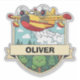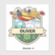 Dieser personalisierte Aufkleber zeigt ein lächelndes gelbes und rotes Feuerlöschflugzeug, das Wasser über einen glücklichen Wald mit fröhlichen Bäumen und Wolken sprüht.