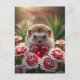 Ein süßer Igel, der ein rotes Granat-Herz hält, sitzt in einem Beet aus roten und weißen Nelken.
