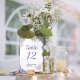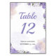 Eine elegante Tischnummer mit lila Blumendesign, die den Gästen eine gemütliche und romantische Touch bietet.