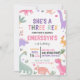 Feiern Sie den dritten Geburtstag Ihres kleinen Mädchens mit dieser reizenden dinosaurierthematischen Einladung! Mit sanften Pastellfarben, süßen Mädchen-Dinos und spielerischen handgezeichneten Illustrationen ist dieses "She's a Three Rex"-Design perfekt für eine lustige und fröhliche Kindergeburtstagsfeier.