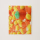 Dieses niedliche Halloween-Puzzlespiel kennzeichnet ein Foto von Süßigkeitsmais und -kürbisen.