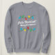 Un pull de Noël moche amusant qui est en espagnol et en anglais. Il dit "¡Feliz navidad!" et "Joyeux Noël." Le design est très festif mais simple.