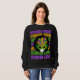 Sweatshirt élégant Afro MARDI GRAS dans les couleurs populaires de violet, or et vert. Le design montre une silhouette afro noire portant un masque masqué. L'expression MARDI GRAS est répétée dans les mêmes couleurs dans l'arrière - plan en caractères gras. Idéal Mardi Gras sweatshirt à porter dans les rues de Louisiane, de la Nouvelle-Orléans, au Brésil, et partout Mardi Gras est célébré.