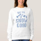Un sweatshirt de ski amusant avec un dessin de montagnes d'hiver, d'arbres, d'un skieur, et le dicton humoristique "jusqu'à la neige bien".