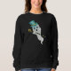 Ce sweatshirt a un fantôme blanc avec un visage idiot qui a de grands yeux bleus et une bouche ouverte tenant une canne noire et or surmontée d'un crâne et portant un chapeau bleu dessus.