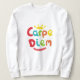 Carpe Diem, Seize The Day design shows hand drawn colorful lettering with the the sun rising above and a big smile below. Make the most of today!