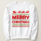 Ce sweatshirt blanc présente un design imitant un pull de Noël traditionnel. Les mots "MERRY CHRISTMAS" sont affichés en rouge, entourés de motifs festifs, dont des rennes, des arbres de Noël, des flocons de neige et des formes géométriques en rouge, vert et or. Au-dessus du texte, le Père Noël dans son traîneau tiré par des rennes est représenté en silhouette rouge.