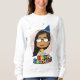 L'oeuvre d'art présente une jeune fille élégante aux cheveux foncés longs, aux lunettes et boucles d'oreilles dorées, portant une tenue jaune vif et tenant une tasse de café ☕. Elle est prête à faire la fête avec un casquette d’anniversaire bleu 🎂, dressé contre un arrière - plan géométrique festif rempli de détails colorés.