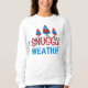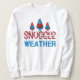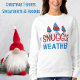 Sweatshirt amusant Gnomes mignonne pour dames conçu avec trois mignons Gnomes rouges et bleus sur un arrière - plan blanc. Le texte est conçu en rouge vif et bleu avec garniture de neige et comprend : Météo à bascule! Fait un grand cadeau de Noël.