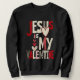 Un design audacieux, de style vintage, avec le texte "Jesus Is My Valentine" en motif, comme les coeurs rouges, les patchs noirs et rouges, et les empreintes de léopard. L'agencement vertical et les tons muets crème, rouge et noir créent une déclaration frappante et sincère pour la Saint-Valentin