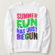 phrase ludique Summer Fun Has Just Begun en lettres colorées et audacieuses, parfait pour mettre l'ambiance pour une saison amusante à venir.