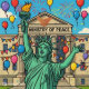 Un design satirique à double face puissant : Front : La Statue de la Liberté célèbre joyeusement devant le grand ministère de la Paix, entouré de ballons, feux d'artifice et décorations festives. Retour : Un tour plus sombre — La liberté s'est réduite à mendier devant le ministère intimidant de la Guerre, exposant l'ironie entre les promesses politiques et la réalité. Cette oeuvre audacieuse de style dessin animé contraste l'optimisme avec la dure vérité, mêlant humour, symbolisme et commentaires politiques. Parfait pour les vêtements, les affiches, les tasses et autres objets POD pour ceux qui aiment l'art expressif et inspirant.