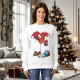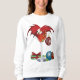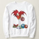 Un dragon rouge dans un verre à martini tenant une olive verte. Des ornements, un présent et des olives vertes tout autour.