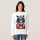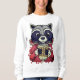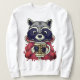 Un joli raton laveur portant un sweat - shirt à capuche rouge tient une tasse de chocolat chaud