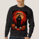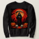 Une représentation effrayante de la Grande Faucheuse au milieu des citrouilles, des crânes et des arbres stériles sous la lueur d'une lune rouge. Parfait pour les thèmes Halloween et représentant les nuits d'automne.