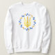 Ce dessin graphique montre le trident symbole national le plus emblématique d'Ukraine (tryzub) et une couronne de fleurs de maïs bleues et d'oreilles jaunes de blé représentant les couleurs du drapeau ukrainien. Ensemble, le symbole et les fleurs créent un effet harmonieux et stimulant. Ce dessin proclame fièrement l'identité et la culture ukrainiennes, célébrant la force et la beauté du peuple ukrainien.