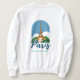 Ce design est une illustration charmante et stylisée de la Tour Eiffel, présentée dans un cadre voûté, qui lui donne une allure de fenêtre ou d'emblématique badge. La tour Eiffel est dépeinte dans une teinte brun doré et chaude, haute contre un ciel bleu clair avec des nuages doux et blancs. Des arbres et des feuillages verdoyants sont visibles au pied de l'hôtel, évoquant le paysage parisien environnant. Sous l'illustration principale, le mot "Paris" est écrit dans une police de caractères élégante et fluide, dans une couleur bleu-vert foncé, lui donnant une touche de lettrage à la main. Plus loin, dans une petite police sans-serif vert clair et propre, se trouve le slogan romantique "LA VILLE DE L'AMOUR". L'esthétique générale est fantaisiste, amicale, et évoque un sentiment de romantisme et de voyage, avec un toucher légèrement texturé ou peint aux couleurs.