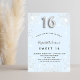 Eine moderne, stilvolle und glamouröse Einladung für eine Girl's Sweet 16, 16. Geburtstagsparty. Babyblau, mit Imitaten verziert, silberfarbener Glitzer. Personalisieren Sie Ihren Namen und Ihre Party-Daten und fügen Sie diese hinzu. Nummer 16 wird mit einem Schriftart im Ballonstil geschrieben, Skript.