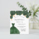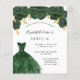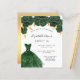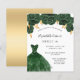 Eine moderne, stilvolle und glamouröse Einladung zu einer Sweet 16. Geburtstagsfeier. Auf der Vorderseite: Weißer Hintergrund mit grünen Imitaten Glitzer Staub, ein smaragdgrünes Kleid und grüne Rose, Blumen. Der Name ist mit einem modernen handgeschriebenen Stilskript geschrieben. Personalisieren Sie Ihre Party-Daten und fügen Sie sie hinzu. Zurück: Imitate goldener Hintergrund.