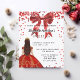 Eine moderne, stilvolle und glamouröse Einladung zu einer Sweet 16. Geburtstagsfeier. Weißer Hintergrund mit Konfetti, rotes Kleid und rotem Bogen. Der Name ist mit einem modernen handgeschriebenen Stilskript geschrieben. Personalisieren Sie Ihre Party-Daten und fügen Sie sie hinzu. 1 Blatt = 1 Einladung mit Druckkante bis Kante.