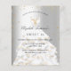 Eine moderne, stilvolle und glamouröse Einladung zu einer Sweet 16. Geburtstagsfeier. Ein silbermetallicer Hintergrund mit Imitaten, goldenen Glitzer Glitzern und einem weißen Kleid. Der Name ist mit einem modernen handgeschriebenen Stilskript geschrieben. Personalisieren Sie Ihre Party-Daten und fügen Sie sie hinzu.