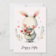 A fluffy white bunny with rosy cheeks holds a bouquet of spring flowers, surrounded by hearts and botanical accents. This whimsical design radiates warmth and joy, perfect for sending Easter love to friends and family.