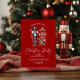 "Warme Wünsche für eine schöne Weihnachtszeit! Begleiten Sie uns für ein zauberhaftes Weihnachtsgebäck, das mit einem charmanten Nussknacker und einem süßen Bonbon geschmückt ist. Feiern wir mit der eleganten roten Typografie auf einem ruhigen Feiertagsroten Hintergrund.
