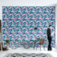 Ein nahtloses Muster mit weißen und rosa Delphinen, die in einem blauen Meer mit rosa und blauen Pflanze schwimmen. Das Design vereint eine pulsierende Unterwasserszene mit verspielten Delphinen und farbenfroher Wasserflora.