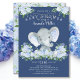 Niedliches Babyduschdesign mit einem hübschen Elefanten, umgeben von hübschen blauen Blume-Bouquets-Set auf dunkelblauem Hintergrund. Dreh unsere Einladung zu einem koordinierenden Blumenbacken für eine besondere Touch.