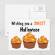 Auf den Postkarten gibt es 3 Halloween-Kuchen mit orangefarbenem Zuckerguss und Bonbonmais, auf denen oben steht, wünscht euch ein SWEET Halloween.
