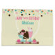 Personalisiert Happy Geburtstag Geschenktasche. Farbenfrohe Konfetti an der Spitze. Illustriert mit einer Schokoladeneis-Bar, 3-Scoop-Sonnenschirmen mit Kirsche oben und Erdbeerfloat mit getauchten Cremetollops. Kleine Erdbeeren und Kirschen. Gelbe Hintergrundfarbe.