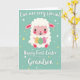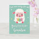 This card features a sweet, stylized lamb with fluffy white fleece and soft pink facial details, gazing forward with big dark eyes and little heart-shaped blush marks that add a tender, affectionate look 🐰. Small pink inner ears and dainty hoof-like feet complete the character as it cuddles three decorated eggs close to its chest like treasured gifts. One egg is sunny yellow with tiny purple speckles, another is spring green with darker dapples, and the third is light pink with deeper magenta accents. The background is a mint-green field sprinkled with small white and golden-yellow stars plus scattered white dots, giving the scene a gentle, celebratory sparkle 🌷. At the top, the phrase “Ewe are very special” appears in a flowing, cursive-style font in a dark tone that stands out clearly against the pastel backdrop. Near the bottom, “Happy First Easter Grandson” is set underneath in a matching dark color, centered and easy to read. The lamb sits centered on the page with the three eggs cradled in front, while the stars and dots are spaced across the mint background around it.