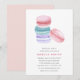 Oh la! Diese Brautdusche mit süßen Brautduschen ist mit einem Stapel von köstlichen französischen Macarons in pastellfarbenen, handbemalten Aquarelltönen in Rosa, Aqua und Lavendel ausgestattet. Personalisieren Sie Ihre Brautparty-Details in rosa und graue Schrift. Eine tolle Wahl für Dessert, französische oder Pariser Brautpartys. Die Einladungen kehren zu massivem Rosa um.