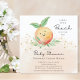 Ein süßer kleiner Pfirsich ist auf dem Weg Babydusche Einladung mit einem hübschen kleinen pfirsichfarbenen & grünen Blätter Set auf einem Aquarellpfirsichboden mit verstreuten Goldkonfetti. Besuchen Sie unseren Shop und sehen Sie sich unsere kleine Pfirsichdesignsammlung an.