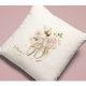 The pillow features beautifully rendered ballet pointe shoes, adorned with flowing pink ribbons that dance around soft blush roses and intricate floral arrangements. Subtle gold glitter and light, ethereal textures add a touch of magic, evoking the dreamlike quality of a grand performance and the sweetness of blossoming youth. It’s a design that whispers of dreams, dedication, and effortless beauty.