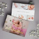 Les annonces de naissance élégantes présentent votre photo préférée de nouveau-né en plein saignement, avec le nom du bébé sur lequel est inscrit le script de calligraphie de feuille d'or. Personnalisez avec les statistiques de naissance du bébé sous. Ajoutez six photos supplémentaires au dos dans une mise en page collage, avec les noms des parents ou de la famille au centre.