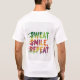 Ein motivierend T - Shirt-Design enthält den Satz "Sweat, Smile, Repeat" in einem bunten, energetischen Schriftart. Die Farben können für einen dynamischen Effekt plattiert oder getropft werden, was das Gefühl von Bewegung und Aktion vermittelt. Der Schriftart selbst könnte mutig und leicht bedrückt sein, was auf die Anstrengung hinweist, die von "Schweiß" ausgeht, aber letztlich den positiven Kreislauf von harter Arbeit und Glück betont.