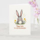Designed with a soft watercolor look, the illustration features a long-eared bunny 🐰 in gentle gray with a white belly and tall ears lightly tinted pink inside. Its simple dark eyes, small smile, and rosy cheeks give it a shy, affectionate expression, as if it’s quietly enjoying someone’s company. The bunny sits among bright yellow six-petaled flowers and fresh green leaves, with slender dark stems adding contrast against the pale fur. The open white background keeps the scene airy and calm, like a quiet spring moment shared between close friends. Below the artwork, a flowing handwritten-style message appears in warm burnt orange, centered near the bottom. A few small leaf shapes and petals seem to lean inward toward the bunny, adding a subtle sense of closeness 🌷. The yellow blossoms cluster around the bunny’s feet while the rest of the background stays crisp white.