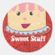 Niedliche Retro-Farbe Rot. Blassblaue und rosa Bäckerei Kekse und Aufkleber für Cookies. Niedliche Niedliche Backwaren mit Adorable Eyes, Pink, Tan und Blau und kissbare Münder mit Ihren Geschäftsinformationen oder verlassen wie mit "Sweet Stuff" in weißer whimsical Schrift.